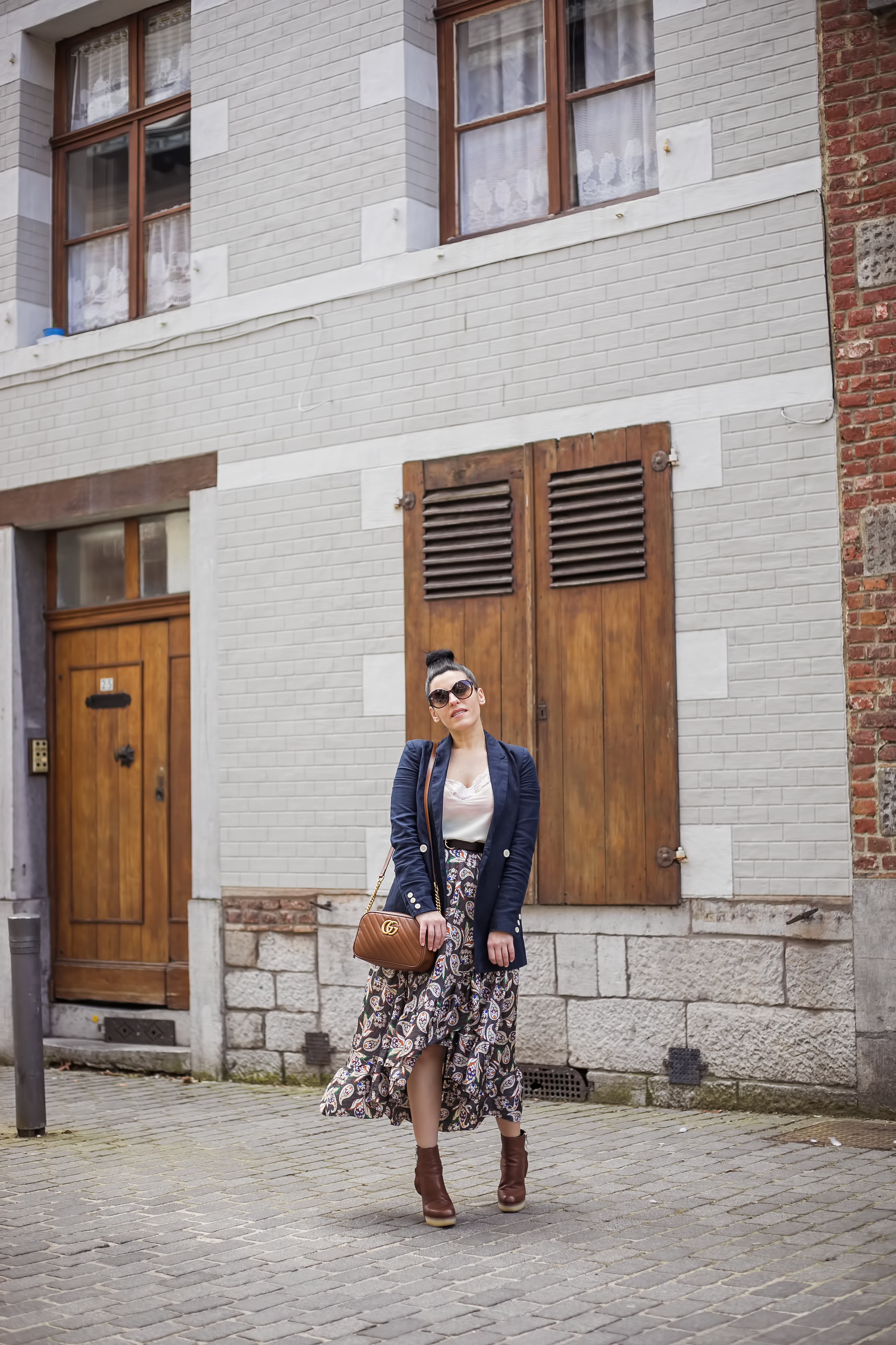 Au moment où j’essaye ma tenue pour la valider avant de partir shooter, le facteur m’apporte ma dernière commande MAJE composée notamment de cette jupe que tu vois ici après, si bien que je compose alors de suite une seconde tenue à l’aide de pièces similaires que je portais déjà : même sac, mêmes boots et même top.