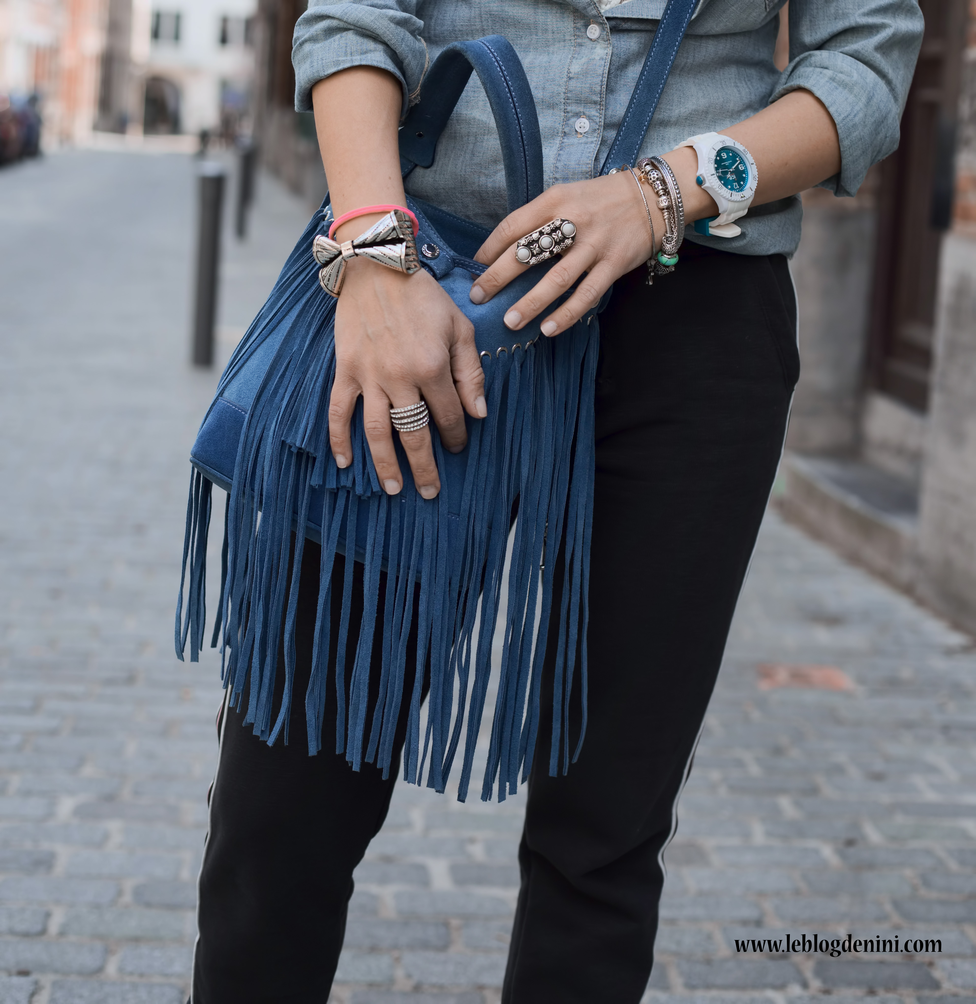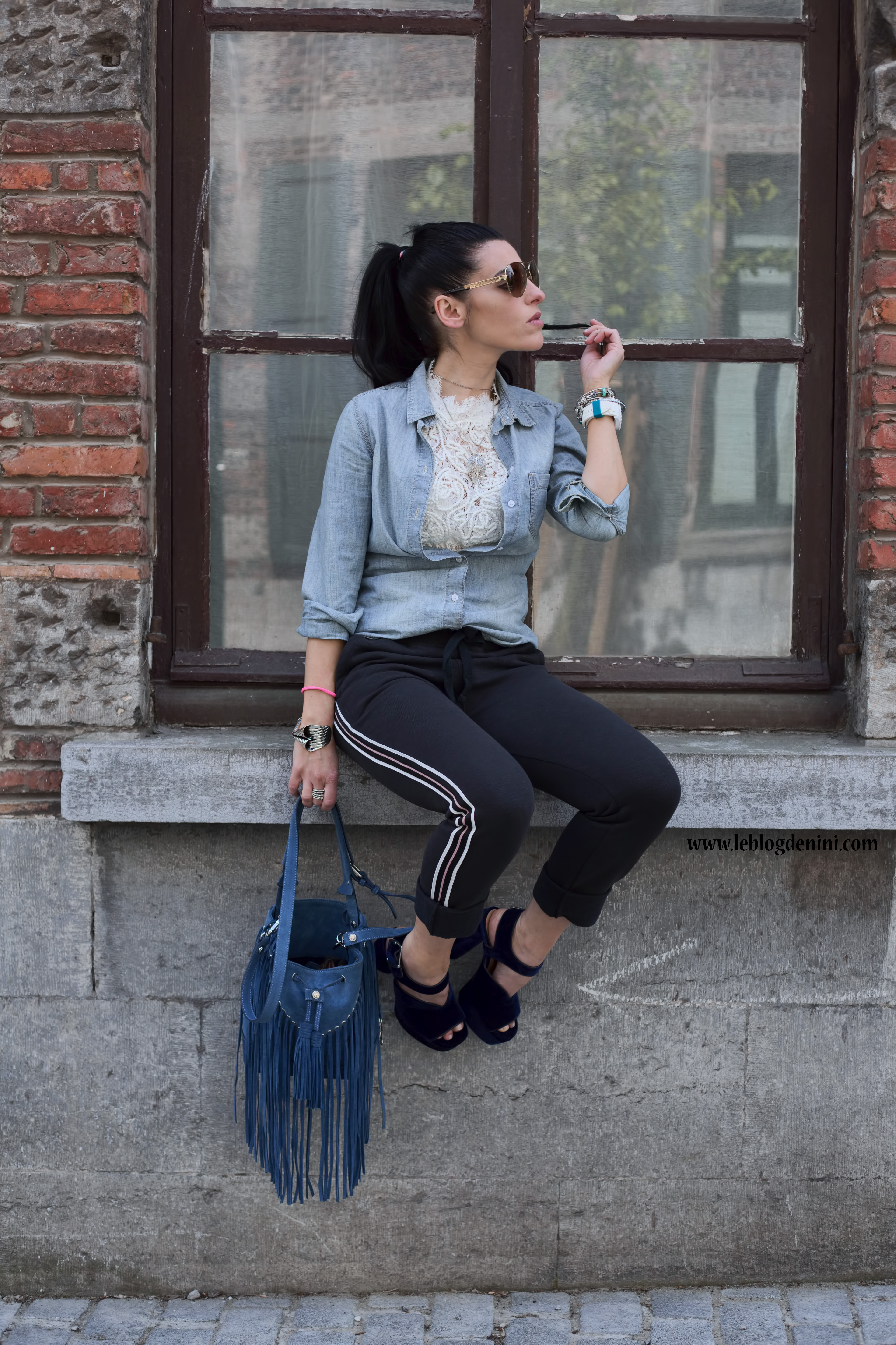 Porter un pantalon de survêtement avec des sandales à talon : de prime abord, l’on se dirait qu’il y a un souci quelque part hahahha. Et avec un sac à franges: l’on peut clairement parler de perte d’esprit hihihi